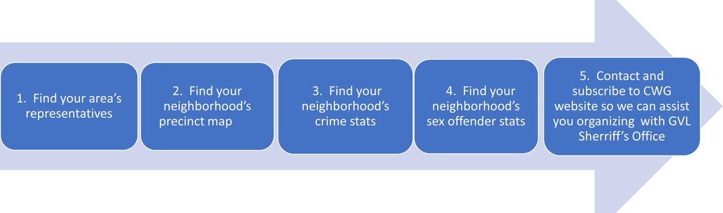 Step 5 is the most critical step: See below: Contact and subscribe to Crime Watch Greenville so that we can assist you organizing with GVL Sherriff's Office.